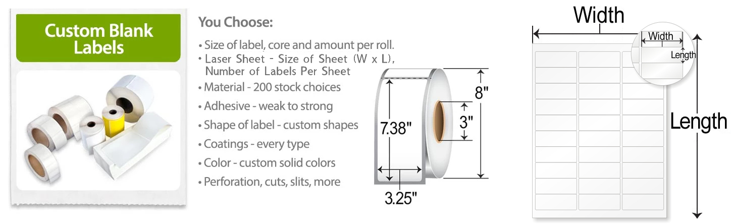 We can manufacture any size labels you need on standard rolls or sheets. We also offer custom quantities per roll.
